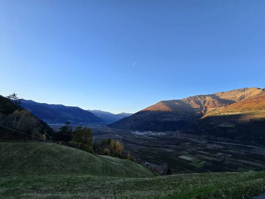 Der Latschander Waalweg zeigt sich im Winter von seiner stillen, fast poetischen Seite. Statt plätscherndem Wasser begleiten sanft fallende Blätter den Weg. Der Waal liegt in dieser Jahreszeit leer und wirkt wie ein ruhender Zeuge alter Bewässerungstradition. Zwischen kahlen Bäumen und klarer Winterluft öffnet sich ein weiter Blick über den Vinschgau. Eine stimmungsvolle, ruhige Wanderung – perfekt für alle, die die stille Schönheit des Winters suchen. HoiDU startet an einem sonnigen Tag in Latsch. Wir überqueren die Straße auf der höhe vom Kreisverkehr und begeben uns in dieses stimmige Abenteuer.